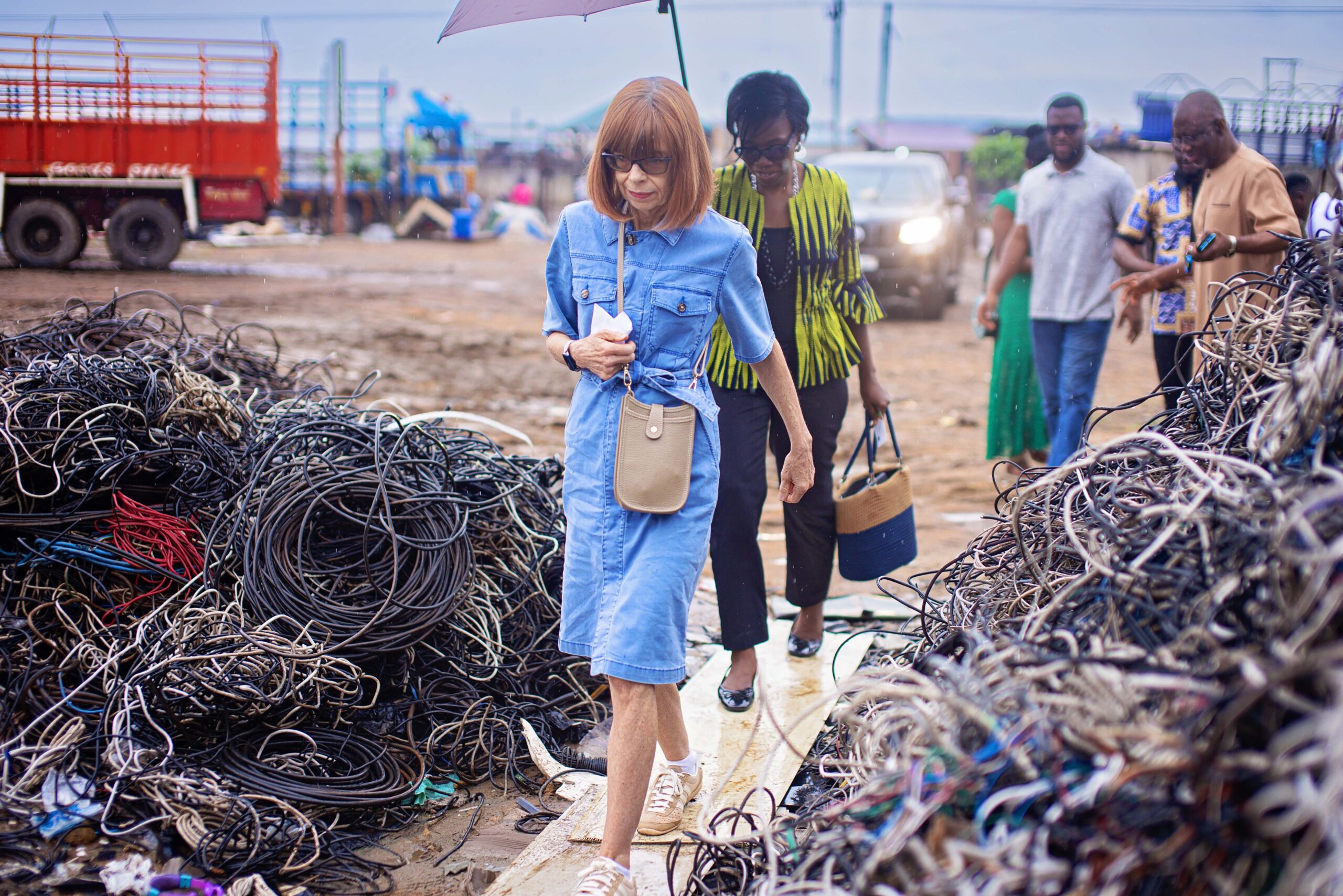 The delegation toured GreenAd’s processing yard, where structured dismantling and recycling are carried out safely, and later visited sections of the Agbogbloshie scrap site, where open burning of cables and informal dismantling persist. The visit highlighted both the progress achieved through formal partnerships and the urgent need for continued education, enforcement, and investment to eliminate unsafe practices.
