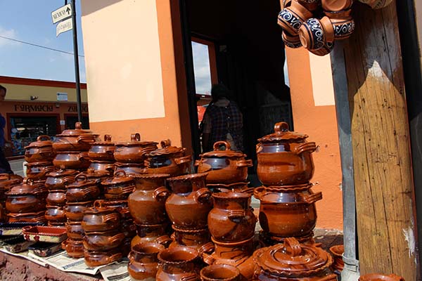 Traditional lead-glazed pottery on sale on the streets of Mexico. These are used in many homes and restaurants across the country. Lead from the pots leach into the food prepared or served in them.